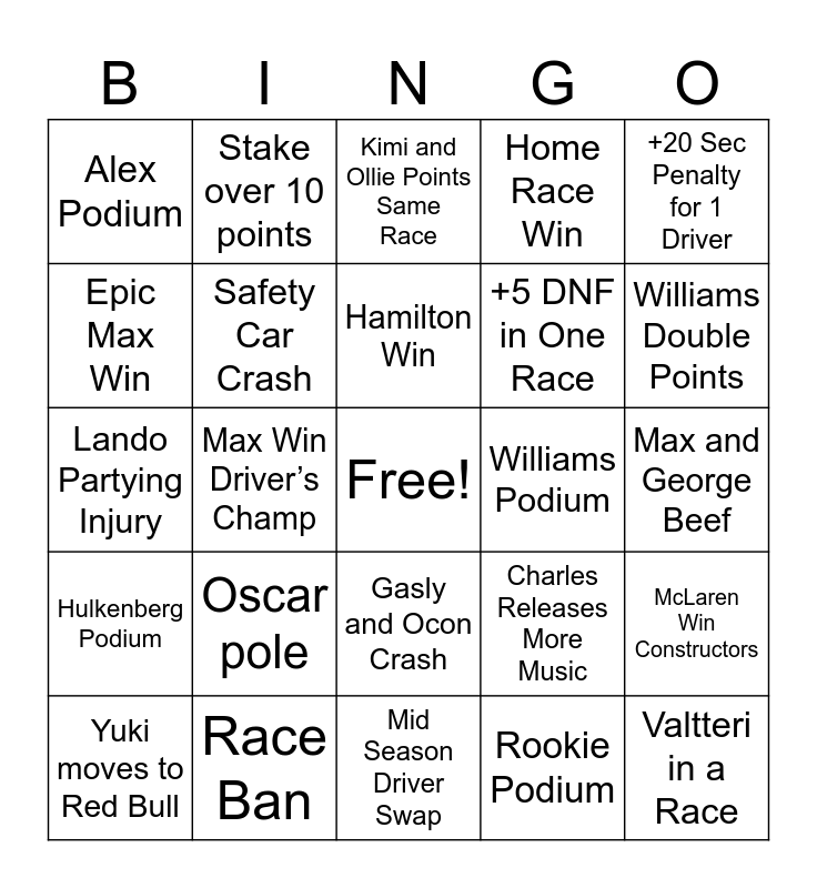 This bingo card has a free space and 24 words: Oscar pole, Race Ban, Hamilton Win, Yuki moves to Red Bull, +20 Sec Penalty for 1 Driver, Alex Podium, Epic Max Win, Stake over 10 points, Williams Podium, Gasly and Ocon Crash, +5 DNF in One Race, Lando Partying Injury, Charles Releases More Music, McLaren Win Constructors, Safety Car Crash, Rookie Podium, Max and George Beef, Kimi and Ollie Points Same Race, Williams Double Points, Max Win Driver’s Champ, Valtteri in a Race, Hulkenberg Podium, Home Race Win and Mid Season Driver Swap.