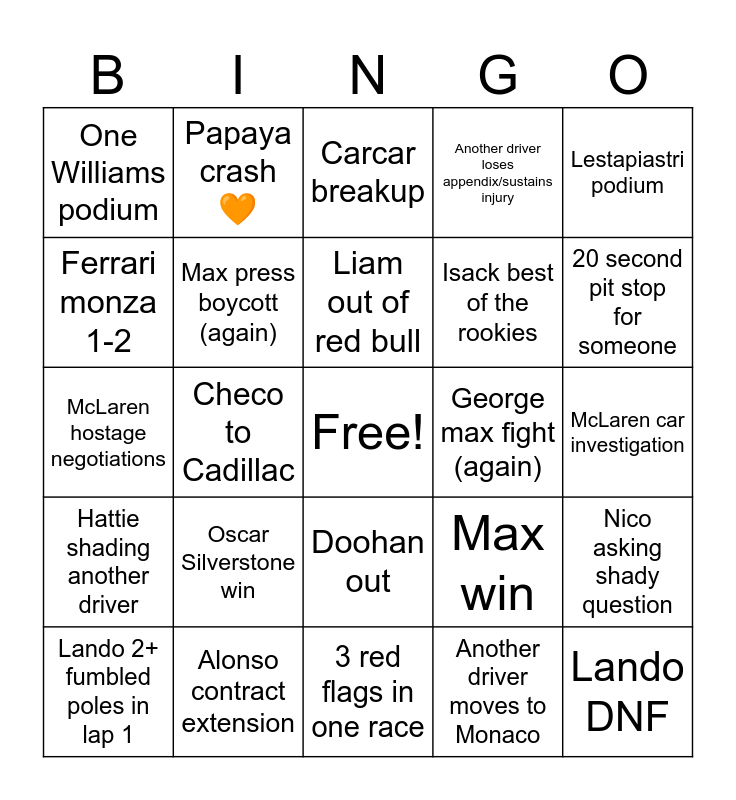 This bingo card has a free space and 25 words: Oscar Silverstone win, 3 red flags in one race, Liam out of red bull, Lando 2+ fumbled poles in lap 1, Lestapiastri podium, One Williams podium, Ferrari monza 1-2, Papaya crash 🧡, George max fight (again), Doohan out, Isack best of the rookies, McLaren hostage negotiations, Max win, Nico asking shady question, Max press boycott (again), Ollie points, McLaren car investigation, Carcar breakup, 20 second pit stop for someone, Checo to Cadillac, Lando DNF, Alonso contract extension, Hattie shading another driver, Another driver loses appendix/sustains injury and Another driver moves to Monaco.