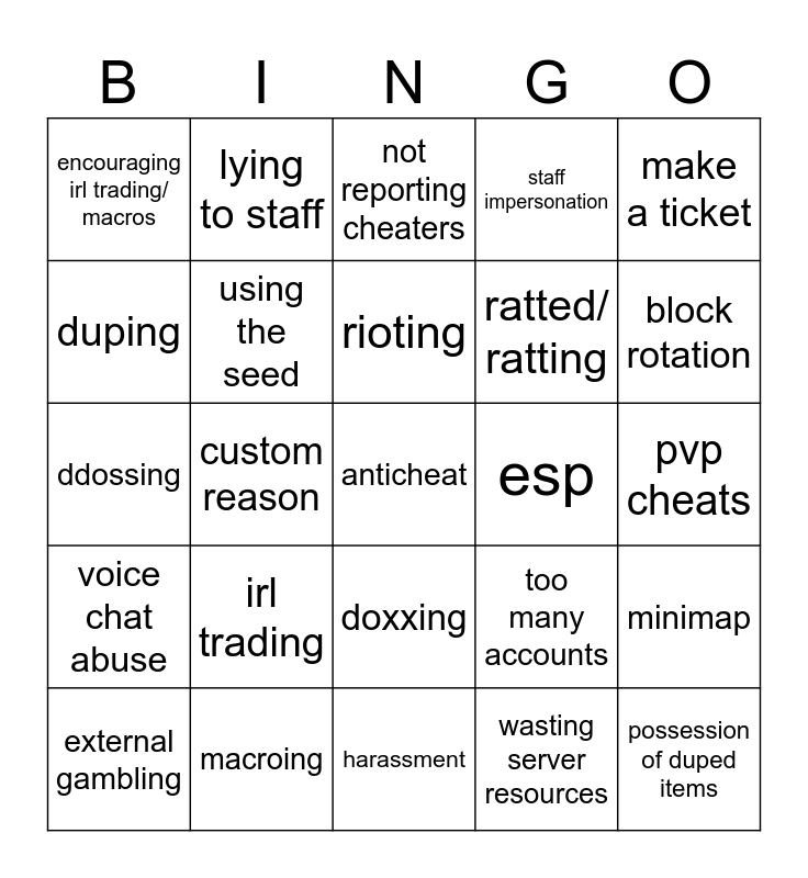 This bingo card has a free space and 24 words: irl trading, macroing, rioting, external gambling, make a ticket, encouraging irl trading/ macros, duping, lying to staff, esp, doxxing, ratted/ ratting, ddossing, too many accounts, minimap, using the seed, wasting server resources, pvp cheats, not reporting cheaters, block rotation, custom reason, possession of duped items, voice chat abuse, staff impersonation and harassment.