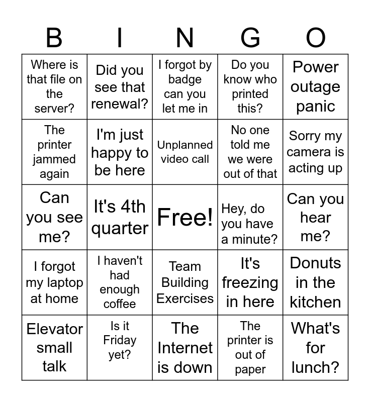This bingo card has a free space and 24 words: I haven't had enough coffee, Is it Friday yet?, Unplanned video call, Elevator small talk, Power outage panic, Where is that file on the server?, The printer jammed again, Did you see that renewal?, Hey, do you have a minute?, Team Building Exercises, No one told me we were out of that, Can you see me?, It's freezing in here, Donuts in the kitchen, I'm just happy to be here, The printer is out of paper, Can you hear me?, I forgot by badge can you let me in, Sorry my camera is acting up, It's 4th quarter, What's for lunch?, I forgot my laptop at home, Do you know who printed this? and The Internet is down.