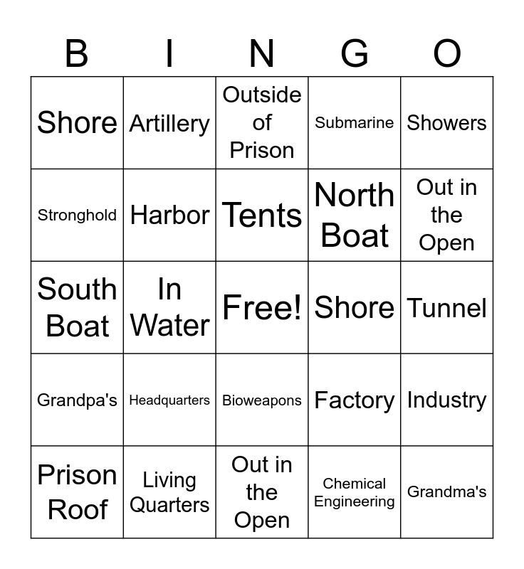 This bingo card has a free space and 24 words: Headquarters, Living Quarters, Tents, Prison Roof, Showers, Shore, Stronghold, Artillery, Shore, Bioweapons, North Boat, South Boat, Factory, Industry, Harbor, Chemical Engineering, Tunnel, Outside of Prison, Out in the Open, In Water, Grandma's, Grandpa's, Submarine and Out in the Open.