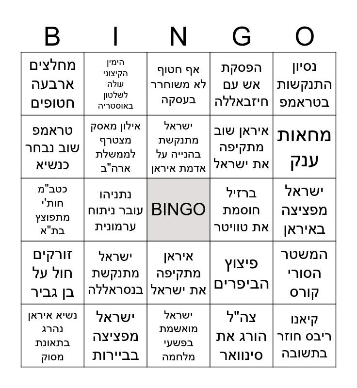This bingo card has a free space and 24 words: ישראל מתנקשת בנסראללה, ישראל מפציצה בביירות, ישראל מתנקשת בהנייה על אדמת איראן, נשיא איראן נהרג בתאונת מסוק, נסיון התנקשות בטראמפ, מחלצים ארבעה חטופים, טראמפ שוב נבחר כנשיא, הימין הקיצוני עולה לשלטון באוסטריה, ברזיל חוסמת את טוויטר, איראן מתקיפה את ישראל, איראן שוב מתקיפה את ישראל, כטב"מ חות'י מתפוצץ בת"א, פיצוץ הביפרים, המשטר הסורי קורס, אילון מאסק מצטרף לממשלת ארה"ב, צה"ל הורג את סינוואר, ישראל מפציצה באיראן, אף חטוף לא משוחרר בעסקה, מחאות ענק, נתניהו עובר ניתוח ערמונית, קיאנו ריבס חוזר בתשובה, זורקים חול על בן גביר, הפסקת אש עם חיזבאללה and ישראל מואשמת בפשעי מלחמה.
