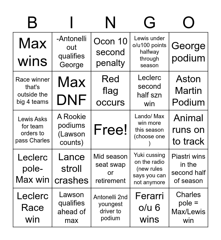 This bingo card has a free space and 29 words: Leclerc Race win, Lando Race win, A Rookie podiums (Lawson counts), Lewis wins a race, Max wins, Ocon 10 second penalty, Max DNF, Lance stroll crashes, Lando/ Max win more this season (choose one ), Lawson qualifies ahead of max, Animal runs on to track, Charles pole = Max/Lewis win, Antonelli 2nd youngest driver to podium, Ferarri o/u 6 wins, Aston Martin Podium, Sainz <20 points, Mid season seat swap or retirement, Leclerc pole- Max win, George podium, Lewis Asks for team orders to pass Charles, Yuki cussing on the radio (new rules says you can not anymore, Alonzo podiums in rain, Leclerc second half szn win, Race winner that's outside the big 4 teams, Lewis under o/u100 points halfway through season, -Antonelli out qualifies George, Piastri wins in the second half of season, Red flag occurs and Ferrari 1-2.