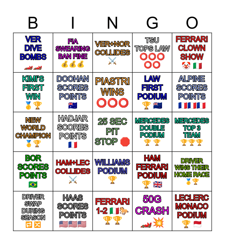 This bingo card has a free space and 24 words: HAM+LEC COLLIDES ⚔️, HAAS SCORES POINTS 🇺🇸🇺🇸🇺🇸, PIASTRI WINS ⭕️⭕️⭕️, DRIVER SWAP DURING SEASON 🔁 🔀, FERRARI CLOWN SHOW 🤡 🇮🇹, VER DIVE BOMBS 🏎️🏎️, KIMI’S FIRST WIN 🥇🏆, FIA SWEARING BAN FINE 💰💰💰, MERCEDES DOUBLE PODIUM 🏆 🏆, WILLIAMS PODIUM 🏆, LAW FIRST PODIUM 🏆 🇳🇿, NEW WORLD CHAMPION 🥇🏆, HAM FERRARI PODIUM 🏆 🇬🇧, DRIVER WINS THEIR HOME RACE 🥇🏆, DOOHAN SCORES POINTS 🇦🇺, 50G CRASH 🏎️💥, MERCEDES TOP 3 TEAM 🏆🏆🏆, VER+NOR COLLIDES ⚔️, ALPINE SCORES POINTS 🇫🇷🇫🇷🇫🇷, HADJAR SCORES POINTS 🇫🇷, LECLERC MONACO PODIUM 🏆 🇲🇨, BOR SCORES POINTS 🇧🇷, TSU TOPS LAW ⭕️⭕️⭕️ ⭕️⭕️ and FERRARI 1-2 🇮🇹🐎 🏆🏆.
