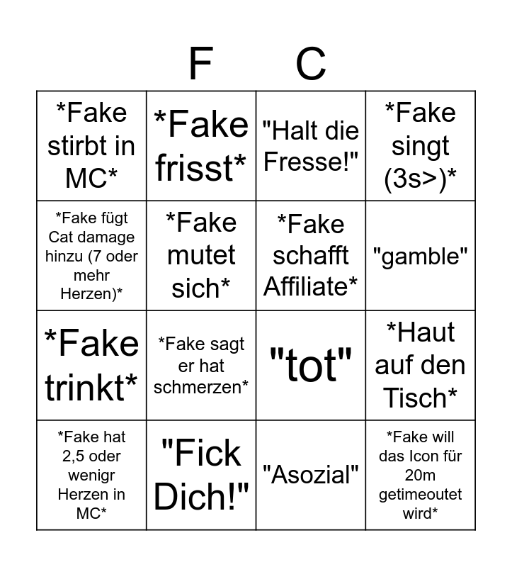 This bingo card has 16 words: "Fick Dich!", *Haut auf den Tisch*, "Halt die Fresse!", *Fake stirbt in MC*, *Fake trinkt*, *Fake frisst*, "tot", "Asozial", *Fake fügt Cat damage hinzu (7 oder mehr Herzen)*, *Fake mutet sich*, *Fake hat 2,5 oder wenigr Herzen in MC*, *Fake singt (3s>)*, *Fake sagt er hat schmerzen*, "gamble", *Fake schafft Affiliate* and *Fake will das Icon für 20m getimeoutet wird*.