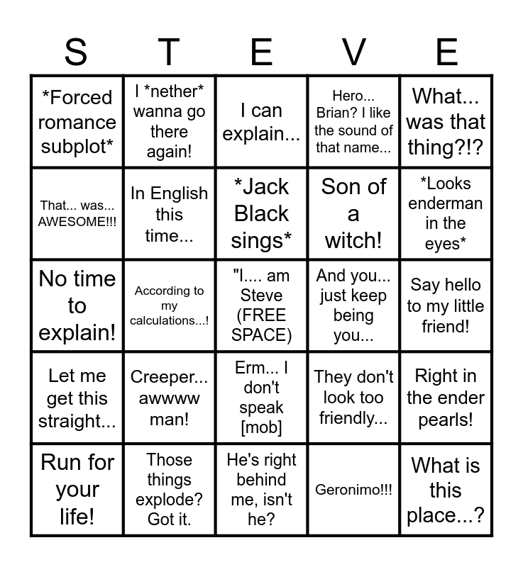 This bingo card has a free space and 49 words: *Thunderstruck plays*, What is this place...?, "I just broke that tree... with my HAND?!?!, He's right behind me, isn't he?, Creeper... awwww man!, You guys might wanna see this..., I *nether* wanna go there again!, We've got company!, That... was... AWESOME!!!, You can say that again!, In English this time..., Hero... Brian? I like the sound of that name..., Right in the ender pearls!, They don't look too friendly..., You forgot the #1 rule of Minecraft! Never dig straight down!, Are you thinking what I'm thinking...?, *Jack Black sings*, And you... just keep being you..., What... just happened...?, What... was that thing?!?, According to my calculations...!, Geronimo!!!, *Forced romance subplot*, Son of a witch!, *Fake out death*, *Looks enderman in the eyes*, Run for your life!, *Post credits scene*, Erm... I don't speak [mob], Let me get this straight..., This isn't you..., *Deceptively cute but evil mob*, *Youtuber Cameo*, *Character says the name of the movie*, Those things explode? Got it., *Notch reference*, *Montage before the final battle*, *Crafting montage*, Say hello to my little friend!, They can fly now..., *Jack Black's dog dies*, *Minecart chase scene*, I'll hold them off... Get out of here!, It's craftin' time!, No time to explain!, I can explain..., That's gonna leave a mark!, Why don't you pick on someone your own size! and *Sexual Innuendo*.