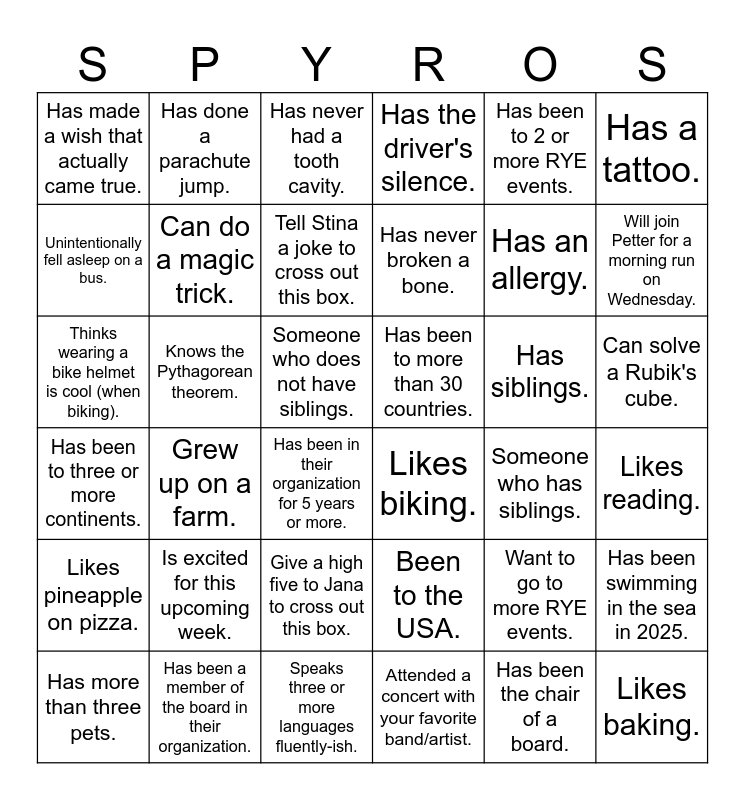 This bingo card has 36 words: Been to the USA., Give a high five to Jana to cross out this box., Attended a concert with your favorite band/artist., Unintentionally fell asleep on a bus., Has been to three or more continents., Has been to more than 30 countries., Can do a magic trick., Speaks three or more languages fluently-ish., Has been to 2 or more RYE events., Want to go to more RYE events., Will join Petter for a morning run on Wednesday., Has the driver's silence., Has been swimming in the sea in 2025., Knows the Pythagorean theorem., Has never broken a bone., Has made a wish that actually came true., Likes pineapple on pizza., Has siblings., Thinks wearing a bike helmet is cool (when biking)., Has never had a tooth cavity., Someone who does not have siblings., Grew up on a farm., Likes biking., Has been in their organization for 5 years or more., Someone who has siblings., Has done a parachute jump., Has an allergy., Has been a member of the board in their organization., Tell Stina a joke to cross out this box., Has a tattoo., Likes baking., Has more than three pets., Likes reading., Can solve a Rubik's cube., Is excited for this upcoming week. and Has been the chair of a board..