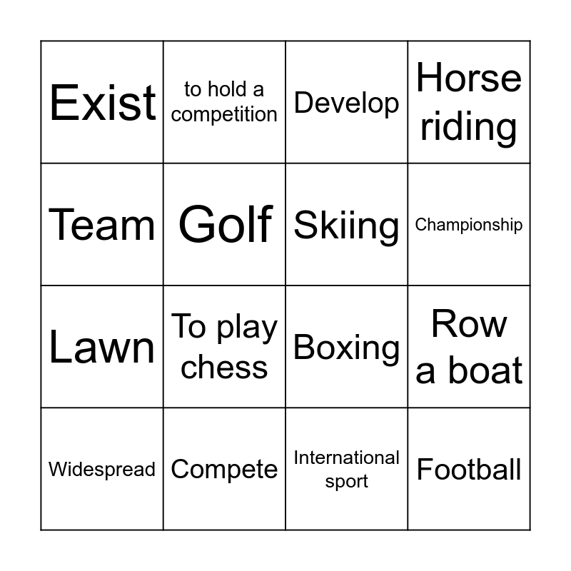 This bingo card has 20 words: Row a boat, Invent, Develop, Probably, Widespread, Team, Compete, Exist, Lawn, to hold a competition, To play chess, Boxing, Golf, Football, Skiing, Athletics, Championship, Horse riding, International sport and Match.