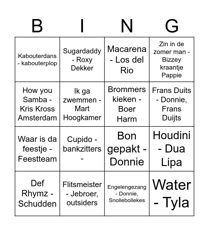 This bingo card has 32 words: Europapa - Joost Klein, Engelbewaarder - Marco Schuitemaker, Houdini - Dua Lipa, Alles op gevoel - Flemming, Water - Tyla, Brommers kieken - Boer Harm, How you Samba - Kris Kross Amsterdam, We will rock you - Queen, Sugardaddy - Roxy Dekker, Lose Control - Teddy Swims, Frans Duits - Donnie, Frans Duijts, Macarena - Los del Rio, Gangnam Style - PSY, padellen - Turfy Gang, Flitsmeister - Jebroer, outsiders, Het fluitlied - Bas Hoeflaak, Pepas - Farruko, Bon gepakt - Donnie, Stumblin In - Cyril, Fireball - Pitbull, John Ryan, Links rechts - Snollebollekes, Noodgeval - Goldband, Engelengezang - Donnie, Snollebollekes, Viva Hollandia - Wolter Kroes, Def Rhymz -Schudden, Zin in de zomer man - Bizzey kraantje Pappie, Waar is da feestje - Feestteam, Ik ga zwemmen - Mart Hoogkamer, Kabouterdans - kabouterplop, Leuk - Antoon, Big2, Vogeltjesdans - de Electronica's and Cupido - bankzitters -.