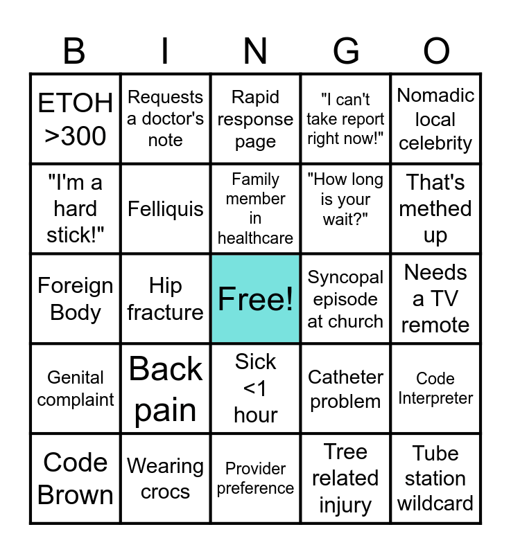 This bingo card has a free space and 24 words: Back pain, Wearing crocs, Family member in healthcare, Code Brown, Nomadic local celebrity, ETOH >300, "I'm a hard stick!", Requests a doctor's note, Syncopal episode at church, Sick <1 hour, "How long is your wait?", Foreign Body, Catheter problem, Code Interpreter, Felliquis, Tree related injury, Needs a TV remote, Rapid response page, That's methed up, Hip fracture, Tube station wildcard, Genital complaint, "I can't take report right now!" and Provider preference.
