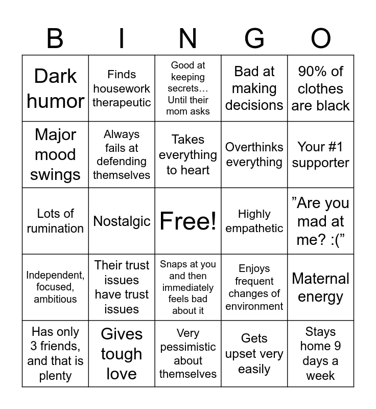 This bingo card has a free space and 24 words: Their trust issues have trust issues, Gives tough love, Takes everything to heart, Has only 3 friends, and that is plenty, 90% of clothes are black, Dark humor, Major mood swings, Finds housework therapeutic, Highly empathetic, Snaps at you and then immediately feels bad about it, Overthinks everything, Lots of rumination, Enjoys frequent changes of environment, Maternal energy, Always fails at defending themselves, Gets upset very easily, ”Are you mad at me? :(”, Good at keeping secrets… Until their mom asks, Your #1 supporter, Nostalgic, Stays home 9 days a week, Independent, focused, ambitious, Bad at making decisions and Very pessimistic about themselves.