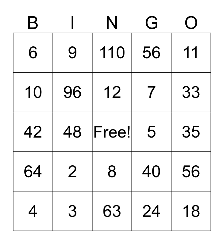 This bingo card has a free space and 24 words: 2, 3, 12, 4, 11, 6, 10, 9, 5, 8, 7, 42, 40, 56, 96, 24, 35, 110, 33, 48, 18, 64, 56 and 63.