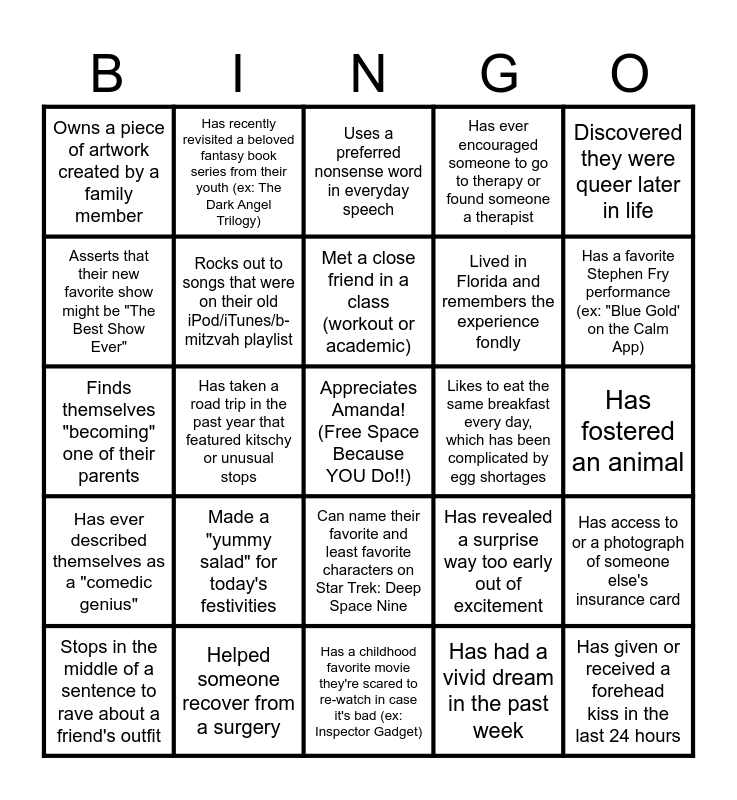 This bingo card has a free space and 49 words: Has a cat who they consider the "Best In The World", Has given or received a forehead kiss in the last 24 hours, Is a mental health professional or educator, Has a childhood favorite movie they're scared to re-watch in case it's bad (ex: Inspector Gadget), Made a "yummy salad" for today's festivities, Enjoys a hyper-specific genre of short-form video (ex: pimple-popping), Has recently revisited a beloved fantasy book series from their youth (ex: The Dark Angel Trilogy), Has ever had their day completely changed by a Diet Coke, Asserts that their new favorite show might be "The Best Show Ever", Is wearing something they got at a thrift store, Rocks out to songs that were on their old iPod/iTunes/b-mitzvah playlist, Has ever encouraged someone to go to therapy or found someone a therapist, Has access to or a photograph of someone else's insurance card, Has revealed a surprise way too early out of excitement, Can give a multi-item tour of the things they got for free in their apartment, Sleeps best when it is very cold (may use the AC in the winter), Met a close friend in a class (workout or academic), Likes to eat the same breakfast every day, which has been complicated by egg shortages, Has seen a movie in the theaters at least three times (ex: Wicked), Discovered they were queer later in life, Has taken a road trip in the past year that featured kitschy or unusual stops, Has had a vivid dream in the past week, Owns a piece of artwork created by a family member, Lived in Florida and remembers the experience fondly, Has taken or administered an ADHD assessment, Has a favorite Stephen Fry performance (ex: "Blue Gold' on the Calm App), Stops in the middle of a sentence to rave about a friend's outfit, Feels strongly about the good and bad versions of something (ex: pickles), Can name their favorite and least favorite characters on Star Trek: Deep Space Nine, Has ever described themselves as a "comedic genius", Brought something to fidget with, Knows the middle names of all their roommates, Plays a sport in a rec league, Has a library card on their person, Helped someone recover from a surgery, Experiences "cute aggression" with animals or babies, Said the wrong words to a common idiom to hilarious effect, Gets frequent photo updates on a beloved baby/toddler, Has fostered an animal, Enjoys driving in real life and in Mario Kart, Used "body doubling" to do something they had been procrastinating for a long time, Has been to a second night Passover seder, Prefers mimosas with a 3 to 1 OJ to booze ratio, Has given an article of clothing to a friend, Finds themselves "becoming" one of their parents, Uses a preferred nonsense word in everyday speech, Has worn the same Halloween costume more than once (ex: identity thief), Has lived in at least two NYC boroughs and Has been a mentor to a young person who matters a lot to them.
