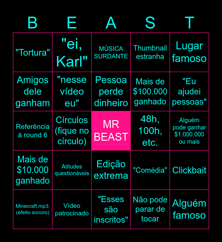 This bingo card has a free space and 35 words: TEXTO APARECENDO, Pessoa ganha dinheiro, Alguém chora, "nesse vídeo eu", Edição extrema, Thumbnail estranha, Amigos dele ganham, 50 pessoas, 100 pessoas, Pessoa perde dinheiro, Meme no meio do vídeo, Referência à round 6, Lugar famoso, Desafio de dias (dia 1, 100 dias), Carro ganhado, "Tortura", 48h, 100h, etc., Não pode parar de tocar, Círculos (fique no círculo), Mais de $10.000 ganhado, Alguém famoso, "Comédia", Minecraft.mp3: (efeito sonoro), Clickbait, Vídeo patrocinado, MÚSICA SURDANTE, "Eu ajudei pessoas", Epilepsia, Mais de 10 espaços usados, Mais de $100.000 ganhado, Alguém pode ganhar $1.000.000 ou mais, Youtubers similares recomendados, "Esses são inscritos", Atitudes questionáveis, "ei, Karl" and Repetição de desafio.