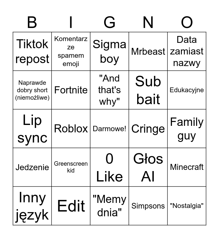 This bingo card has a free space and 24 words: Greenscreen kid, Edit, "And that's why", Inny język, Data zamiast nazwy, Tiktok repost, Naprawde dobry short (niemożliwe), Komentarz ze spamem emoji, Cringe, 0 Like, Sub bait, Lip sync, Głos AI, Minecraft, Fortnite, Simpsons, Family guy, Sigma boy, Edukacyjne, Roblox, "Nostalgia", Jedzenie, Mrbeast and "Memy dnia".