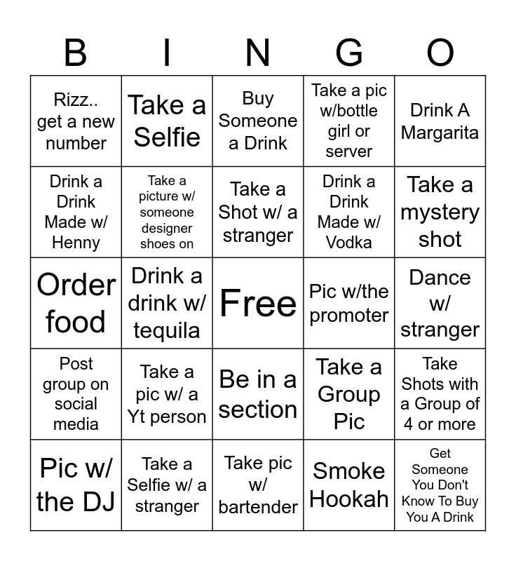 This bingo card has a free space and 24 words: Take a pic w/ a Yt person, Take a Selfie w/ a stranger, Take a Shot w/ a stranger, Pic w/ the DJ, Drink A Margarita, Rizz.. get a new number, Drink a Drink Made w/ Henny, Take a Selfie, Pic w/the promoter, Be in a section, Drink a Drink Made w/ Vodka, Order food, Take a Group Pic, Take Shots with a Group of 4 or more, Take a picture w/ someone designer shoes on, Smoke Hookah, Dance w/ stranger, Buy Someone a Drink, Take a mystery shot, Drink a drink w/ tequila, Get Someone You Don't Know To Buy You A Drink, Post group on social media, Take a pic w/bottle girl or server and Take pic w/ bartender.