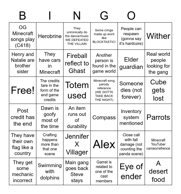 This bingo card has 36 words: Alex, Jennifer X Villager, Garret is related to one of the cast members, Henry and Natalie are brother sister, Post credit has the end, Minecraft song parody reference (WE GOTTA TAKE BACK THE NIGHT), They have cars in Minecraft, Main gang goes back Steve stays, People can respawn (gonna say it’s hardcore), Close call with fall damage (not counting the panda scene), Real world people looking for the gang, Some cringe made up word like BLOCKTASTIC!, Minecraft YouTuber cameo/refrence, The credits tare in the form of the end game credits, Another person is found in the game world, OG Minecraft songs play (C418), They have their own flag like a country, Someone dies (not forever), Free!, They unironically do the dance/music WE DEFEATED THE VILLAIN, Totem used, Dawn is goofy most of the time, Compass, An item runs out of durability, Inventory system mentioned, Herobrine, Elder guardian, Swimming with dolphins, Fireball reflect to Ghast, Wither, A desert food, They get some mechanic incorrect, Parrots, Cube gets lost, Crafting happens more than that one scene and Eye of ender.