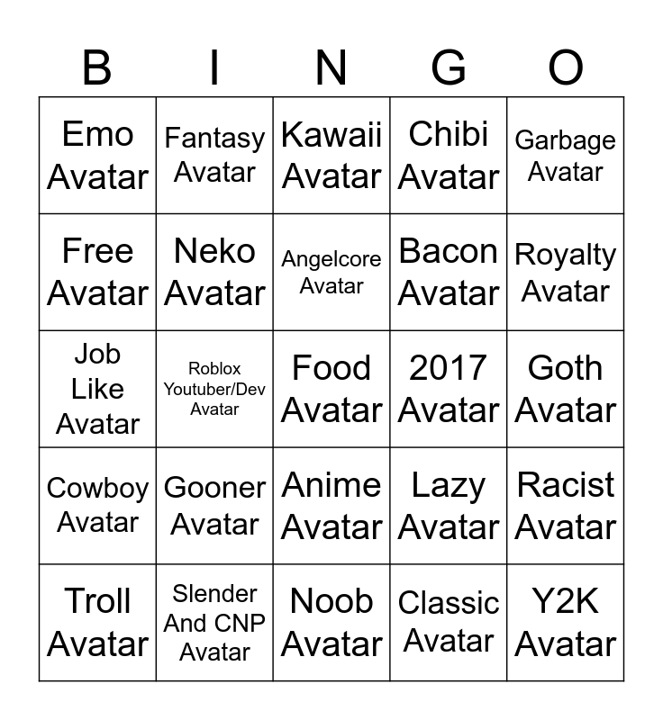 This bingo card has 25 words: Gooner Avatar, Noob Avatar, Angelcore Avatar, Troll Avatar, Garbage Avatar, Emo Avatar, Free Avatar, Fantasy Avatar, 2017 Avatar, Anime Avatar, Bacon Avatar, Job Like Avatar, Lazy Avatar, Racist Avatar, Neko Avatar, Y2K Avatar, Goth Avatar, Kawaii Avatar, Royalty Avatar, Roblox Youtuber/Dev Avatar, Food Avatar, Slender And CNP Avatar, Cowboy Avatar, Chibi Avatar and Classic Avatar.