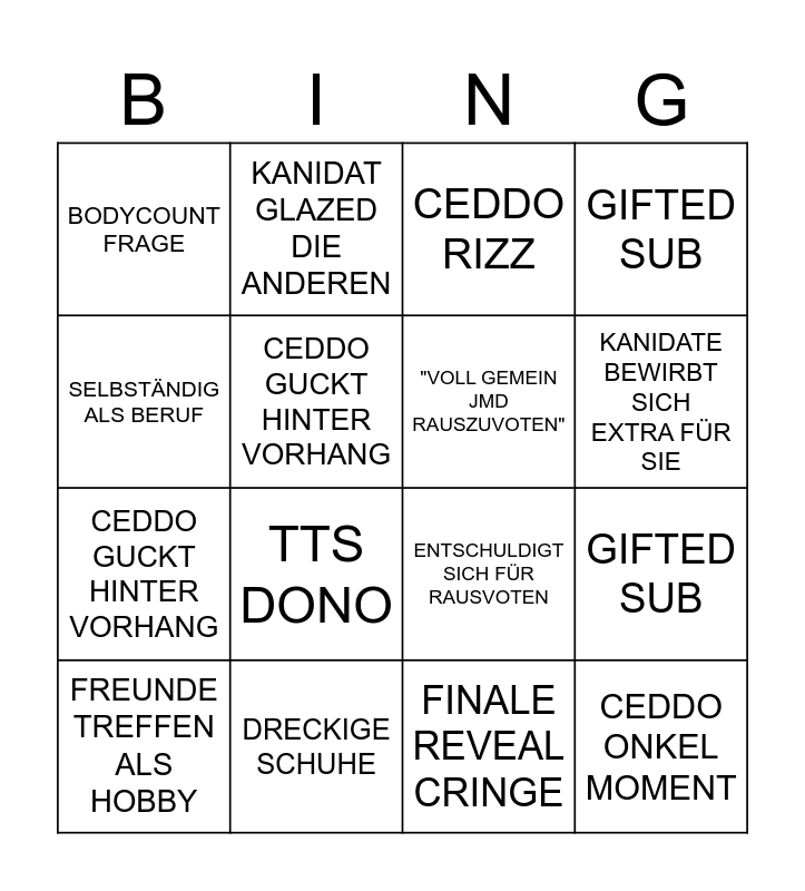 This bingo card has 16 words: DRECKIGE SCHUHE, GIFTED SUB, CEDDO RIZZ, BODYCOUNT FRAGE, CEDDO GUCKT HINTER VORHANG, KANIDAT GLAZED DIE ANDEREN, ENTSCHULDIGT SICH FÜR RAUSVOTEN, FINALE REVEAL CRINGE, SELBSTÄNDIG ALS BERUF, CEDDO GUCKT HINTER VORHANG, FREUNDE TREFFEN ALS HOBBY, GIFTED SUB, TTS DONO, KANIDATE BEWIRBT SICH EXTRA FÜR SIE, "VOLL GEMEIN JMD RAUSZUVOTEN" and CEDDO ONKEL MOMENT.