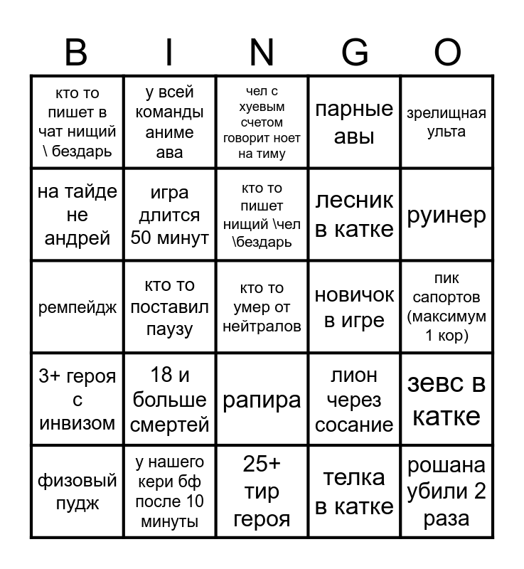 This bingo card has a free space and 29 words: физовый пудж, zxc в нике, кто то поставил паузу, герой из доты на аве, кто то пишет в чат нищий \ бездарь, чел с хуевым счетом говорит ноет на тиму, игра длится 50 минут, 18 и больше смертей, новичок в игре, у нашего кери бф после 10 минуты, пик сапортов (максимум 1 кор), рошана убили 2 раза, 25+ тир героя, телка в катке, руинер, фурион через пушинг, рапира, 3+ героя с инвизом, зрелищная ульта, ремпейдж, лион через сосание, 4+ казуала в одной тиме, лесник в катке, на тайде не андрей, парные авы, у всей команды аниме ава, зевс в катке, кто то пишет нищий \чел \бездарь and урон по постройкам 10к.