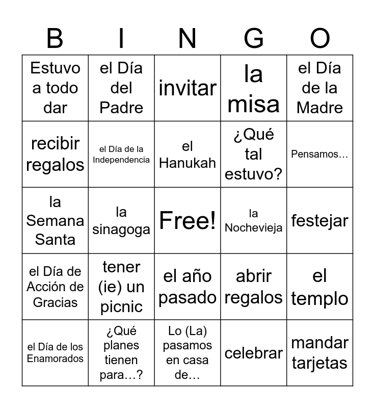 This bingo card has a free space and 34 words: el Año Nuevo, celebrar, como siempre, decorar la casa, el Día de Acción de Gracias, el Día de la Independencia, el Día de la Madre, el Día de los Enamorados, el Día del Padre, hacer una fiesta, el Hanukah, invitar, la Navidad, la Nochebuena, la Nochevieja, Pensamos…, ¿Qué planes tienen para…?, la Semana Santa, tener (ie) un picnic, abrir regalos, el año pasado, los días festivos, Estuvo a todo dar, festejar, Lo (La) pasamos en casa de…, mandar tarjetas, la misa, pasar, ¿Qué tal estuvo?, recibir regalos, reunirse con (toda) la familia, la sinagoga, el templo and ver fuegos artificiales.