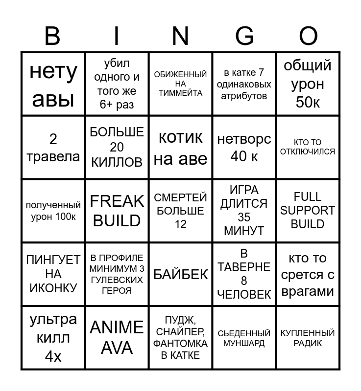 This bingo card has 30 words: ANIME AVA, GHOUL NICKNAME, FREAK BUILD, ТЕЛКА НА АВЕ, нету авы, ОБИЖЕННЫЙ НА ТИММЕЙТА, БОЛЬШЕ 20 КИЛЛОВ, БАЙБЕК, ИГРА ДЛИТСЯ 35 МИНУТ, ПУДЖ, СНАЙПЕР, ФАНТОМКА В КАТКЕ, FULL SUPPORT BUILD, СМЕРТЕЙ БОЛЬШЕ 12, СЬЕДЕННЫЙ МУНШАРД, КУПЛЕННЫЙ РАДИК, КТО ТО ОТКЛЮЧИЛСЯ, РАНДОМНУЛ ГЕРОЯ, В ТАВЕРНЕ 8 ЧЕЛОВЕК, ПИНГУЕТ НА ИКОНКУ, В ПРОФИЛЕ МИНИМУМ 3 ГУЛЕВСКИХ ГЕРОЯ, общий урон 50к, полученный урон 100к, 220 крипов, убил одного и того же 6+ раз, нетворс 40 к, 2 травела, в катке 7 одинаковых атрибутов, кто то срется с врагами, ультра килл 4x, котик на аве and ФАСТ ПУШЕР В ТУРБО.