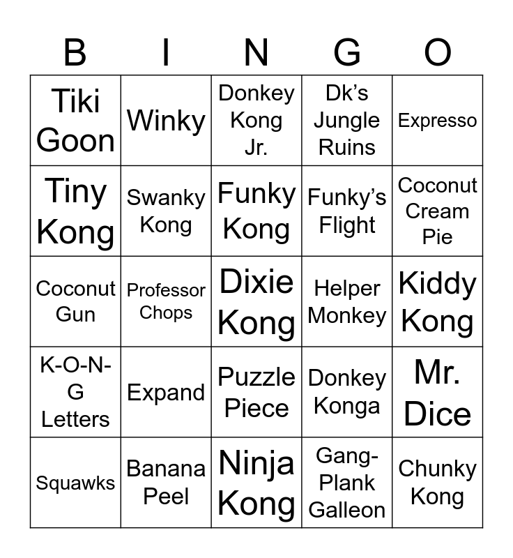 This bingo card has 76 words: Donkey Kong, Ooooh Banana, Donkey Kong Jr., Cranky Kong, DK Snowboard Cross, Lanky Kong, Candy Kong, Klaptrap, King K. Rool, Kremlin, Chunky Kong, Rambi, Funky Kong, Tiny Kong, Enguarde the Swordfish, Professor Chops, Diddy Kong, Dixie Kong, Wrinkly Kong, Expresso, Dk’s Treetop Temple, Coconut Gun, Swanky Kong, Winky, Dk’s Jungle Ruins, Jungle Jams, Pauline, DK Bongo, Jumpman, New Donk City, Stanley, Jungle Hijinx, Lord Fredrik, Donkey Konga, Coconut Cream Pie, Funky’s Flight, Karate Kong, Dk’s Tie, Kiddy Kong, Gang-Plank Galleon, Baby DK, Donkey Kong Barrel Blast, Squitter, Awk, DK Rap, Zinger, Squawks, Tiki Goon, Diddy Kong Racing, Donkey Kong 64, Belcha, Puzzle Piece, Mario vs Donkey Kong, Hogwash, Rattly, Bink, Rare, David Wise, Ellie, Sumo Kong, Expand, Clambo, Drumstick, Banana Queen, Donkey Kong Country, Diddy’s Hat, Helper Monkey, Boomer, Banana Coin, Peanut, Mr. Dice, K-O-N-G Letters, Banana Peel, Jungle Rush, Ninja Kong and Rocket Barrel.