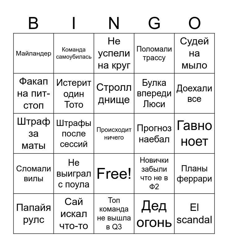 This bingo card has 26 words: Free!, Дед огонь, Стролл днище, Сай искал что-то, Судей на мыло, Майландер, Факап на пит-стоп, Команда самоубилась, Гавно ноет, Новички забыли что не в Ф2, Булка впереди Люси, Штраф за маты, Планы феррари, Папайя рулс, Штрафы после сессий, Ландо проспал старт, Поломали трассу, Сломали вилы, Не успели на круг, Происходит ничего, Доехали все, Топ команда не вышла в Q3, Прогноз наебал, Не выиграл с поула, Истерит один Тото and El scandal.
