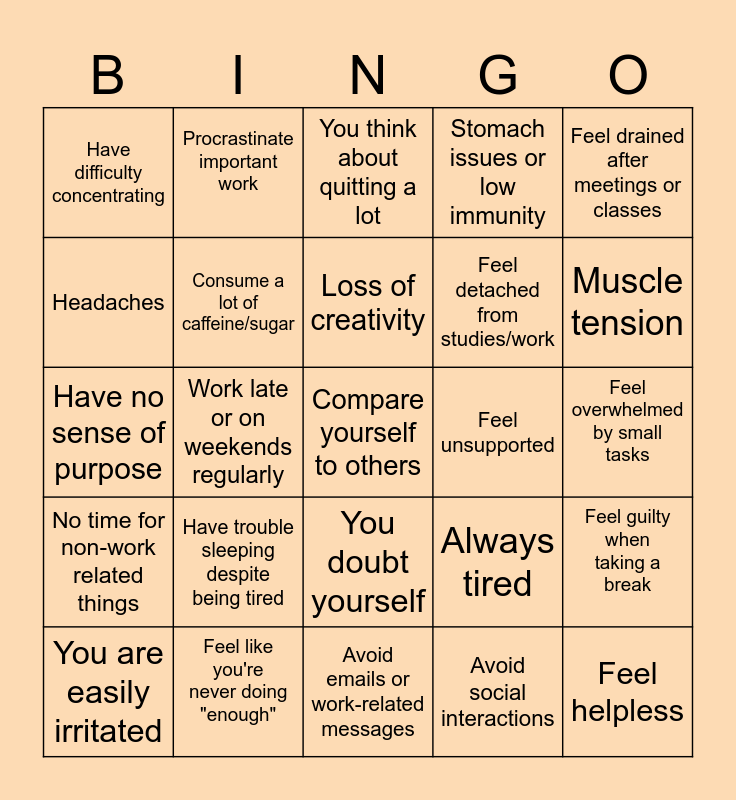 This bingo card has 25 words: Have trouble sleeping despite being tired, Avoid emails or work-related messages, Loss of creativity, You are easily irritated, Feel drained after meetings or classes, Have difficulty concentrating, Headaches, Procrastinate important work, Feel unsupported, You doubt yourself, Feel detached from studies/work, Have no sense of purpose, Always tired, Feel guilty when taking a break, Consume a lot of caffeine/sugar, Feel helpless, Feel overwhelmed by small tasks, You think about quitting a lot, Muscle tension, Work late or on weekends regularly, Compare yourself to others, Feel like you're never doing "enough", No time for non-work related things, Stomach issues or low immunity and Avoid social interactions.