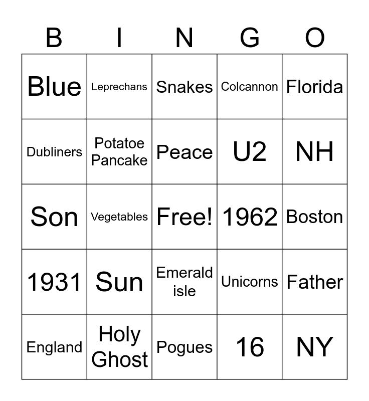 This bingo card has a free space and 39 words: Smithwicks, 5, Succot, Potatoe Pancake, England, Emerald isle, Peace, 1601, Florida, 1931, Vegetables, Colcannon, NY, Boston, 1962, Sun, 10,000, Blue, 63, Unicorns, Dubliners, Pogues, U2, NH, London Eye, Kidnapped, 387, Death, 3, Leprechans, Tree, AU, Snakes, Holy Ghost, 16, 2011, Father, Son and Harp.