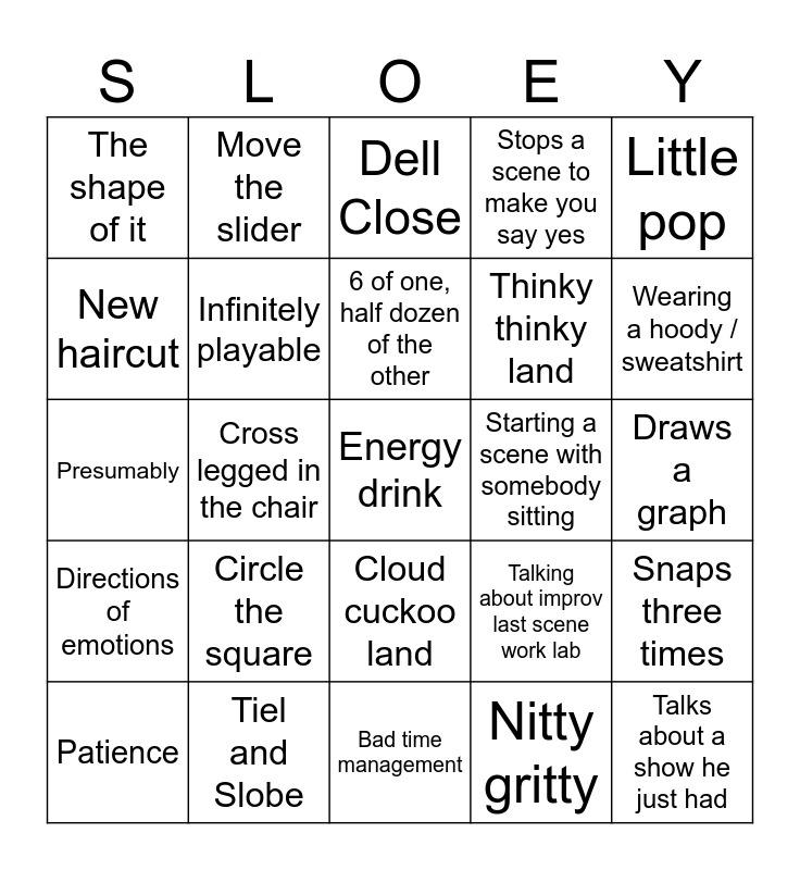 This bingo card has a free space and 24 words: Circle the square, Tiel and Slobe, 6 of one, half dozen of the other, Patience, Little pop, The shape of it, New haircut, Move the slider, Starting a scene with somebody sitting, Cloud cuckoo land, Thinky thinky land, Presumably, Talking about improv last scene work lab, Snaps three times, Infinitely playable, Nitty gritty, Draws a graph, Dell Close, Wearing a hoody / sweatshirt, Cross legged in the chair, Talks about a show he just had, Directions of emotions, Stops a scene to make you say yes and Bad time management.