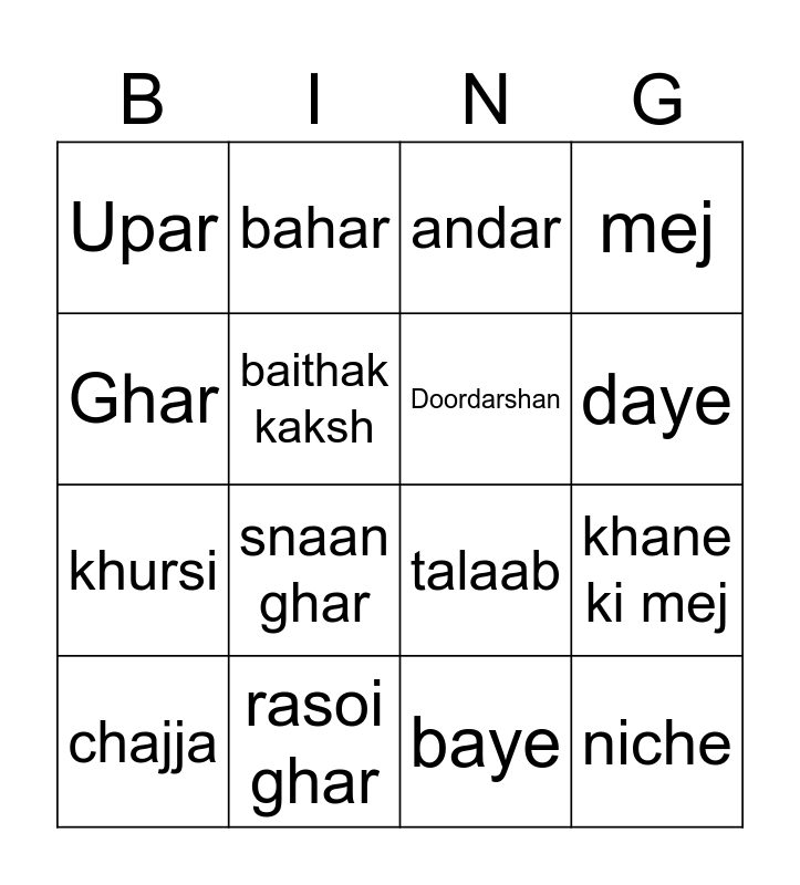 This bingo card has 16 words: rasoi ghar, khane ki mej, andar, Upar, khursi, bahar, talaab, baye, Ghar, baithak kaksh, chajja, mej, snaan ghar, daye, Doordarshan and niche.