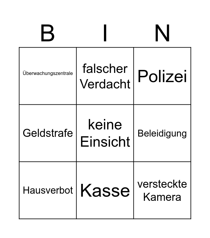 This bingo card has a free space and 8 words: Beleidigung, Polizei, falscher Verdacht, Hausverbot, Überwachungszentrale, versteckte Kamera, Geldstrafe and Kasse.