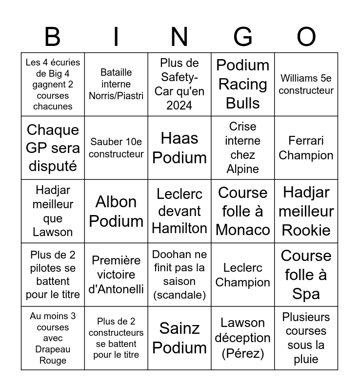 This bingo card has 25 words: Plus de 2 pilotes se battent pour le titre, Plus de 2 constructeurs se battent pour le titre, Leclerc devant Hamilton, Lawson déception (Pérez), Williams 5e constructeur, Les 4 écuries de Big 4 gagnent 2 courses chacunes, Bataille interne Norris/Piastri, Plus de Safety-Car qu'en 2024, Course folle à Monaco, Course folle à Spa, Chaque GP sera disputé, Sauber 10e constructeur, Sainz Podium, Leclerc Champion, Ferrari Champion, Au moins 3 courses avec Drapeau Rouge, Albon Podium, Haas Podium, Crise interne chez Alpine, Hadjar meilleur Rookie, Hadjar meilleur que Lawson, Première victoire d'Antonelli, Doohan ne finit pas la saison (scandale), Podium Racing Bulls and Plusieurs courses sous la pluie.
