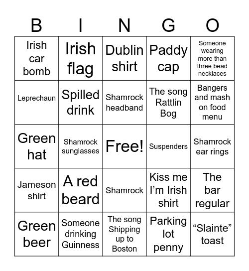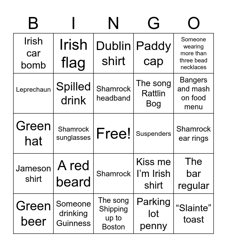 This bingo card has a free space and 24 words: A red beard, Someone drinking Guinness, Shamrock headband, Green beer, Someone wearing more than three bead necklaces, Irish car bomb, Leprechaun, Irish flag, Suspenders, Shamrock, The song Rattlin Bog, Green hat, Kiss me I’m Irish shirt, The bar regular, Spilled drink, Parking lot penny, Shamrock ear rings, Dublin shirt, Bangers and mash on food menu, Shamrock sunglasses, “Slainte” toast, Jameson shirt, Paddy cap and The song Shipping up to Boston.