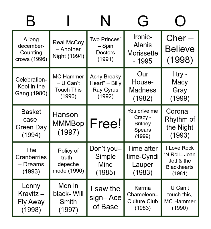 This bingo card has a free space and 33 words: Spice Girls – Wannabe (1996), Backstreet Boys – I Want It That Way (1999), Hanson – MMMBop (1997), Ricky Martin – Livin’ La Vida Loca (1999), The Cranberries – Dreams (1993), MC Hammer – U Can’t Touch This (1990), Cher – Believe (1998), Lenny Kravitz – Fly Away (1998), Real McCoy – Another Night (1994), Smash Mouth – All Star (1999), Achy Breaky Heart" – Billy Ray Cyrus (1992), Two Princes" – Spin Doctors (1991), Don't Speak" – No Doubt (1995), Everlong- Foo Fighters (1997), You drive me Crazy - Britney Spears (1999), I try - Macy Gray (1999), Men in black- Will Smith (1997), Basket case- Green Day (1994), Policy of truth - depeche mode (1990), Time after time-Cyndi Lauper (1983), Don’t you– Simple Mind (1985), Vogue-Madonna (1990), A long december- Counting crows (1996), Corona – Rhythm of the Night (1993), I saw the sign– Ace of Base, U Can’t touch this, MC Hammer (1990), Ironic-Alanis Morissette - 1995, Our House-Madness (1982), Celebration-Kool in the Gang (1980), I Love Rock ‘N Roll– Joan Jett & the Blackhearts (1981), Under Pressure-Queen & David Bowie (1981), Karma Chameleon– Culture Club (1983) and Wake me before you Go-Go—Wham- (1984).