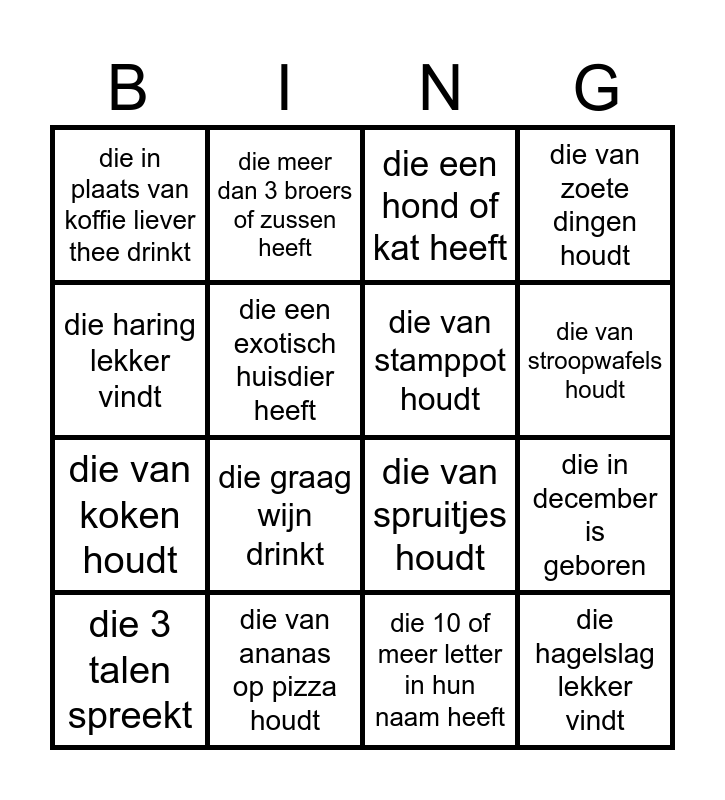 This bingo card has 16 words: die van ananas op pizza houdt, die in december is geboren, die een hond of kat heeft, die in plaats van koffie liever thee drinkt, die van koken houdt, die meer dan 3 broers of zussen heeft, die van spruitjes houdt, die 10 of meer letter in hun naam heeft, die haring lekker vindt, die een exotisch huisdier heeft, die 3 talen spreekt, die van zoete dingen houdt, die graag wijn drinkt, die van stroopwafels houdt, die van stamppot houdt and die hagelslag lekker vindt.