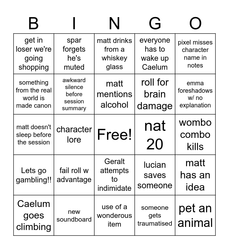 This bingo card has a free space and 32 words: someone gets traumatised, new trauma, character lore, emma wants us to explode, Lets go gambling!!, awkward silence before session summary, pixel misses character name in notes, matt has an idea, spar forgets he's muted, scilla nearly dies, matt mentions alcohol, matt drinks from a whiskey glass, "What could go wrong, "are you sure", nat 20, nat 1, Caelum goes climbing, matt doesn't sleep before the session, Geralt attempts to indimidate, fail roll w advantage, lucian saves someone, emma allows pure insanity, wombo combo kills, new soundboard, pet an animal, everyone has to wake up Caelum, roll for brain damage, something from the real world is made canon, get in loser we're going shopping, use of a wonderous item, retcon and emma foreshadows w/ no explanation.