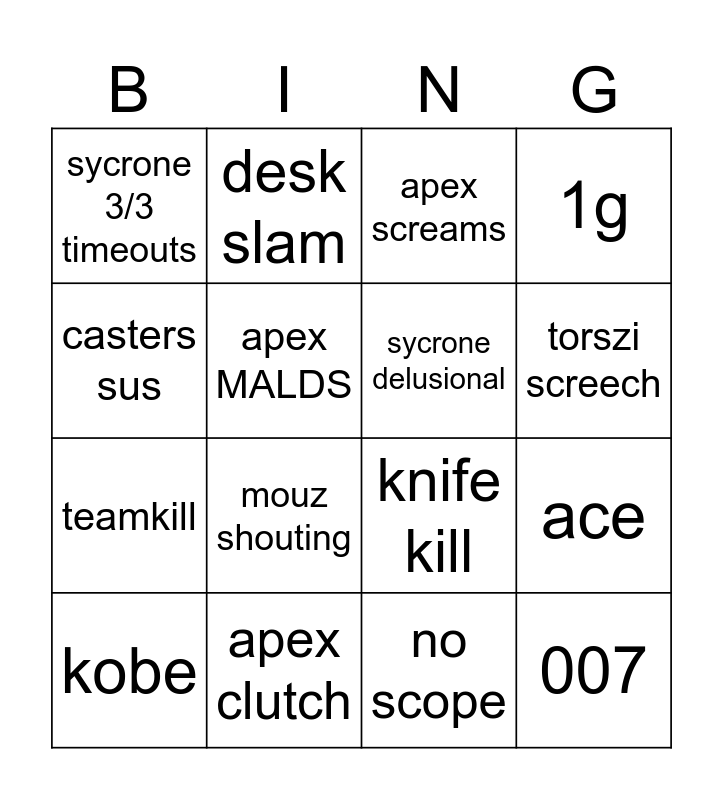 This bingo card has 16 words: apex clutch, ace, apex screams, sycrone 3/3 timeouts, teamkill, desk slam, knife kill, no scope, casters sus, apex MALDS, kobe, 1g, mouz shouting, torszi screech, sycrone delusional and 007.