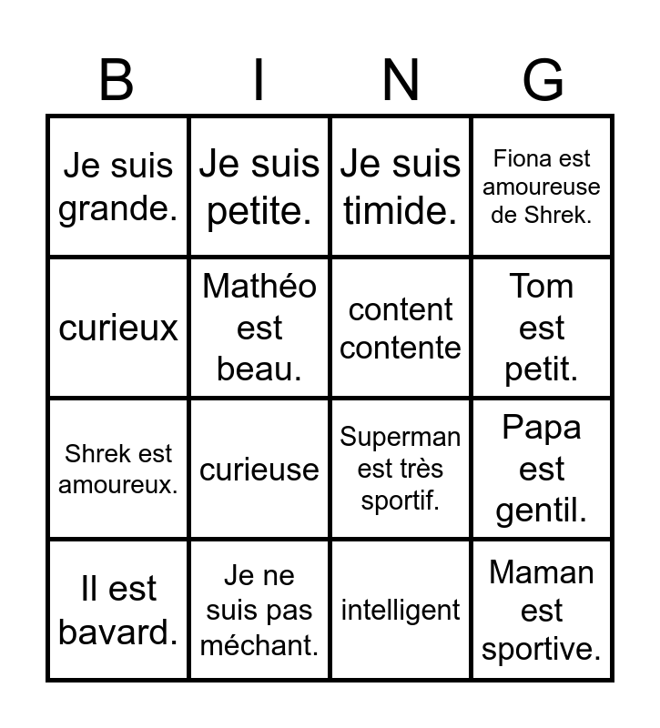 This bingo card has 20 words: Papa est gentil., Lina est belle., Je suis timide., Tu es drôle., Il est bavard., curieux, Je ne suis pas méchant., Je suis grande., Shrek est amoureux., Je suis petite., curieuse, Superman est très sportif., Mathéo est beau., Maman est sportive., content contente, La fille est bavarde., Tom est petit., Fiona est amoureuse de Shrek., intelligent and intelligente.