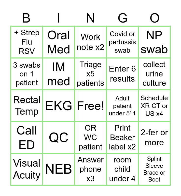 This bingo card has a free space and 24 words: QC, NEB, Triage x5 patients, Visual Acuity, NP swab, + Strep Flu RSV, 3 swabs on 1 patient, Oral Med, Adult patient under 5' 1, OR WC patient, Enter 6 results, Rectal Temp, Print Beaker label x2, 2-fer or more, IM med, room child under 4, Schedule XR CT or US x4, Work note x2, collect urine culture, EKG, Splint Sleeve Brace or Boot, Call ED, Covid or pertussis swab and Answer phone x3.