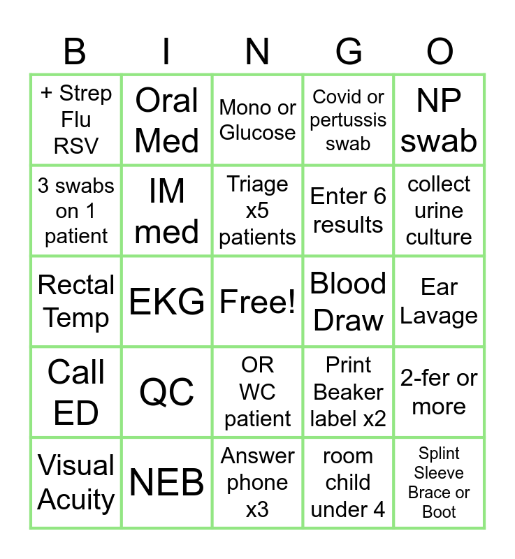 This bingo card has a free space and 24 words: QC, NEB, Triage x5 patients, Visual Acuity, NP swab, + Strep Flu RSV, 3 swabs on 1 patient, Oral Med, Blood Draw, OR WC patient, Enter 6 results, Rectal Temp, Print Beaker label x2, 2-fer or more, IM med, room child under 4, Ear Lavage, Mono or Glucose, collect urine culture, EKG, Splint Sleeve Brace or Boot, Call ED, Covid or pertussis swab and Answer phone x3.