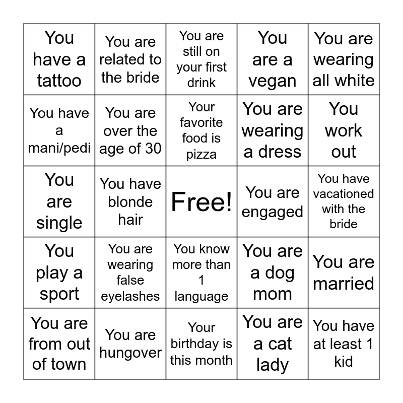 This bingo card has a free space and 24 words: You are wearing false eyelashes, You are hungover, Your favorite food is pizza, You are from out of town, You are wearing all white, You have a tattoo, You have a mani/pedi, You are related to the bride, You are engaged, You know more than 1 language, You are wearing a dress, You are single, You are a dog mom, You are married, You are over the age of 30, You are a cat lady, You have vacationed with the bride, You are still on your first drink, You work out, You have blonde hair, You have at least 1 kid, You play a sport, You are a vegan and Your birthday is this month.