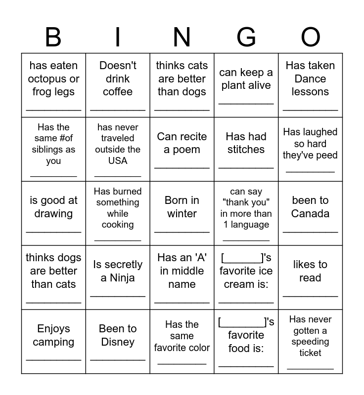 This bingo card has 25 words: Is secretly a Ninja _________, Has the same favorite color _________, Can recite a poem _________, Enjoys camping _________, Has taken Dance lessons _________, has eaten octopus or frog legs _________, Has the same #of siblings as you _________, Doesn't drink coffee _________, can say "thank you" in more than 1 language _________, Has an 'A' in middle name _________, Has had stitches _________, is good at drawing _________, [______]'s favorite ice cream is: _________, likes to read _________, has never traveled outside the USA _________, Has never gotten a speeding ticket _________, been to Canada _________, thinks cats are better than dogs _________, Has laughed so hard they've peed _________, Has burned something while cooking _________, Born in winter _________, Been to Disney _________, thinks dogs are better than cats _________, can keep a plant alive _________ and [_______]'s favorite food is: _________.
