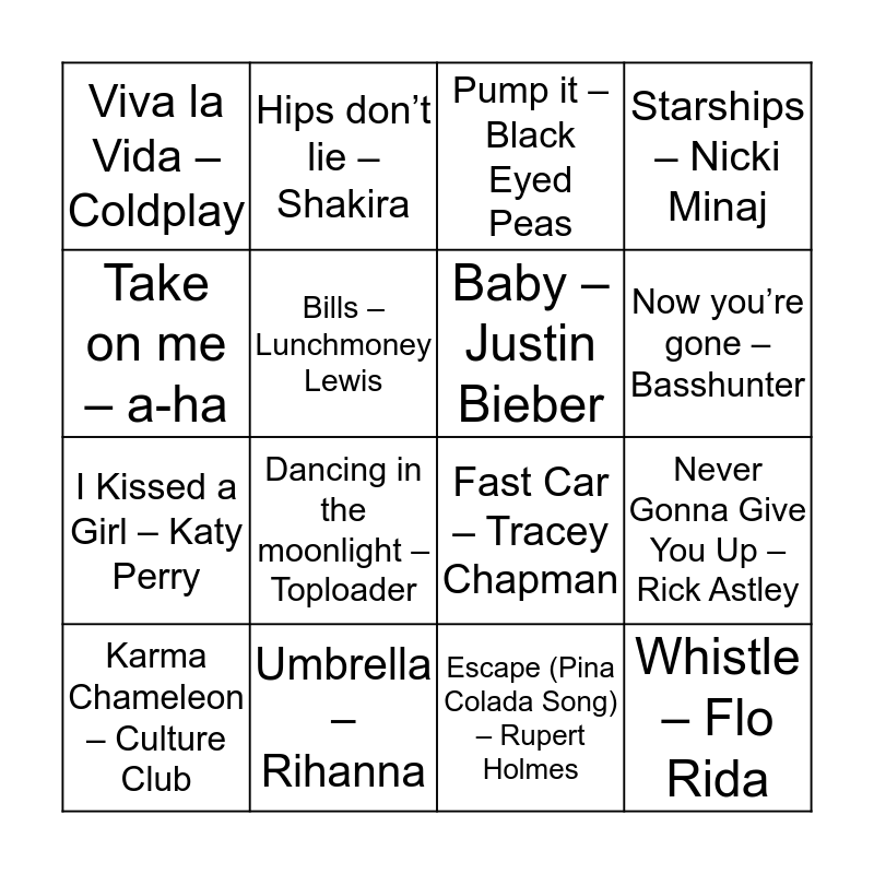 This bingo card has 50 words: Gangnam Style – Psy, Karma Chameleon – Culture Club, Blue (Da Ba Dee) – Eiffel 65, Paradise – Coldplay, September – Earth, Wind and Fire, Am I Wrong – Nico & Vinz, Hips don’t lie – Shakira, My little pony – My little pony theme, Bills – Lunchmoney Lewis, Shake it off – Taylor Swift, Baby – Justin Bieber, Starships – Nicki Minaj, Grenade – Bruno Mars, Hello – Adele, Thinking out loud – Ed Sheeran, Wonderwall – Oasis, Now you’re gone – Basshunter, Umbrella – Rihanna, Dancing Queen – Abba, Take on me – a-ha, Never Gonna Give You Up – Rick Astley, Macarena – Los del Rio, Viva la Vida – Coldplay, I Kissed a Girl – Katy Perry, Year 3000 – Busted, Living on a prayer – Bon Jovi, Dancing in the moonlight – Toploader, Star Wars theme – Star Wars, Pump it – Black Eyed Peas, Boulevard of Broken Dreams – Greenday, Thriller – Michael Jackson, Superstition – Stevie Wonder, Toxic – Britney Spears, Stayin’ Alive – Bee Gees, Single Ladies – Beyonce, All Star – Smash Mouth, Royals – Lorde, American Pie – Don McLean, Hotel California – The Eagles, Escape (Pina Colada Song) – Rupert Holmes, Boyfriend – Justin Bieber, Rehab – Amy Winehouse, Rule the World – Take That, Three Little Birds – Bob Marley, Hey Jude – The Beatles, Fast Car – Tracey Chapman, Waka Waka - Shakira, Worth it – Fifth Harmony, Whistle – Flo Rida and Imagine – John Lennon.