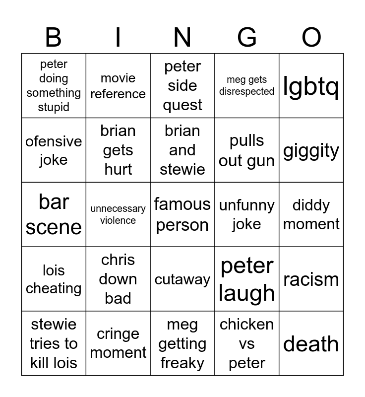 This bingo card has 25 words: chris down bad, meg getting freaky, brian and stewie, stewie tries to kill lois, lgbtq, peter doing something stupid, ofensive joke, movie reference, unfunny joke, cutaway, pulls out gun, bar scene, peter laugh, racism, brian gets hurt, death, diddy moment, peter side quest, giggity, unnecessary violence, famous person, cringe moment, lois cheating, meg gets disrespected and chicken vs peter.