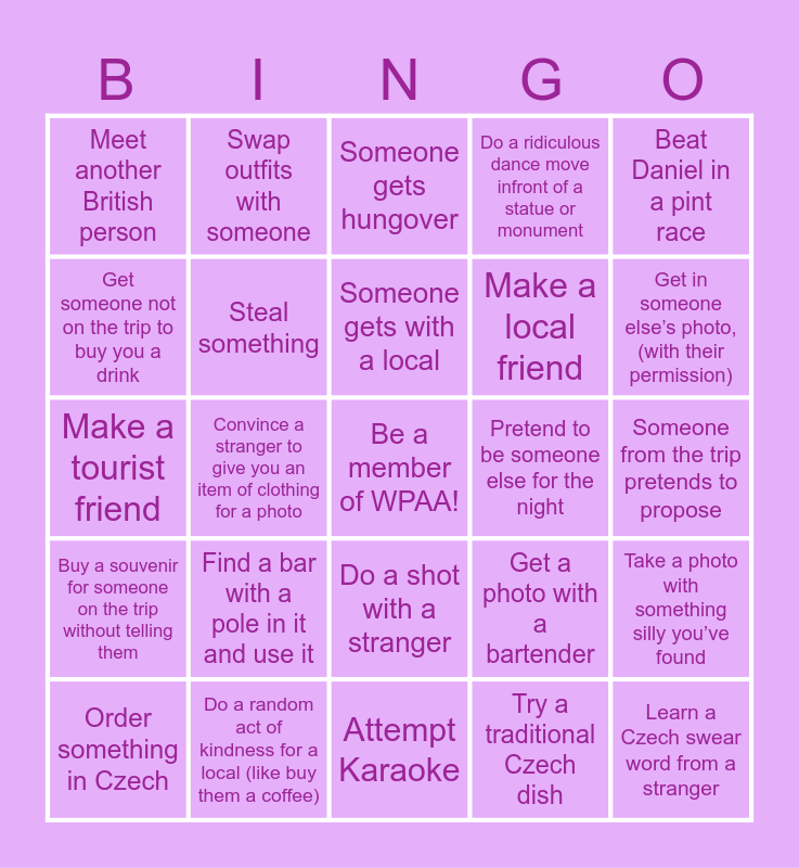 This bingo card has a free space and 25 words: Find a bar with a pole in it and use it, Attempt Karaoke, Someone gets with a local, Order something in Czech, Beat Daniel in a pint race, Meet another British person, Get someone not on the trip to buy you a drink, Swap outfits with someone, Pretend to be someone else for the night, Do a shot with a stranger, Make a local friend, Make a tourist friend, Get a photo with a bartender, Take a photo with something silly you’ve found, Steal something, Someone gets into a fight with a local, Someone from the trip pretends to propose, Someone gets hungover, Get in someone else’s photo, (with their permission), Convince a stranger to give you an item of clothing for a photo, Learn a Czech swear word from a stranger, Do a random act of kindness for a local (like buy them a coffee), Buy a souvenir for someone on the trip without telling them, Do a ridiculous dance move infront of a statue or monument and Try a traditional Czech dish.