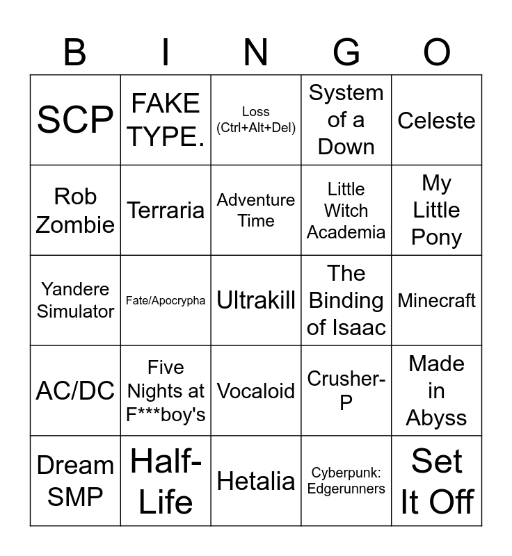 This bingo card has 167 words: Weezer, Jack Stauber, My Chemical Romance, Lemon Demon, Adventure Time, Arcane, Gravity Falls, Happy Tree Friends, Amphibia, The Owl House, The Walking Dead (TV Series), Stardew Valley, Minecraft, Undertale, Deltarune, Life is Strange, Mouthwashing, Studio Ghibli, Little Shop of Horrors, Smiling Friends, House of 1000 Corpses, Hoops & Yoyo, Scott Pilgrim, OMORI, Shrek, People Playground, Slime Rancher, The Walking Dead (Video Game), The Last of Us, The Witcher, OneShot, Danganronpa, Half-Life, Touhou Project, SCP, Pony Island, Superhot, Genshin Impact, Honkai, Neon Genesis Evangelion, Cowboy Bebop, Black Butler, Assassination Classroom, Five Nights at Freddy's, Angel Beats!, Azumanga Daioh, Boku no Hero Academia, Haikyu!!, Cyberpunk: Edgerunners, Demon Slayer, Little Witch Academia, The Promised Neverland, Made in Abyss, Hetalia, Miss Kobayashi's Dragon Maid, Kakegurui, Lost Media Wiki, Screamer Wiki, CWCki (Chris Chan), Tokyo Ghoul, Heartstopper, Jujutsu Kaisen, One Piece, Naruto, Dragon Ball, High-Rise Invasion, Fate/Apocrypha, Hatsune Miku, CircusP / VocaCircus, Vocaloid, Bad Apple!!, Steamed Hams, Loss (Ctrl+Alt+Del), Kira, little purr man, Creep-P, Crusher-P, SAWTOWNE, Ado, DEMONDICE, Mori Calliope, FAKE TYPE., Syko, 100 gecs, Yaelokre, Mindless Self Indulgence, System of a Down, Korn, Slipknot, Ghost, The Living Tombstone, AC/DC, Mother Mother, Set It Off, My Little Pony, Odetari, femtanyl, JPEGMAFIA, Danny Brown, Death Grips, Sabaton, Rob Zombie, Nirvana, Evanescence, Avenged Sevenfold, Dream SMP, Warrior Cats, Red Dead Redemption 2, Animal Crossing, The Beatles, Phasmophobia, The Binding of Isaac, Radiohead, Murder Drones, The Amazing Digital Circus, The Battle Cats, Detroit: Become Human, Scooby-Doo, Rain World, Hollow Knight, Alice: Madness Returns, Call of Duty, Ark: Survival Evolved, Lethal Company, Ultrakill, Dayshift at Freddy's, Sky: Children of the Light, Elden Ring, Dark Souls, The Coffin of Andy and Leyley, Five Nights at F***boy's, Kao the Kangaroo, Baldur's Gate, Webfishing, BTS, Yandere Simulator, Gacha Life, Sword Art Online, Terraria, Team Fortress 2, Among Us, Don't Starve, Super Meat Boy, Cuphead, VRChat, Backrooms, Hello Neighbor, Goat Simulator, The Sims, Gorilla Tag, Blade & Sorcery, Boneworks, Chess for Idiots, Cult of the Lamb, Celeste, They Might Be Giants, Playboi Carti, Twenty One Pilots, Primus, MF DOOM, Steam Powered Giraffe, Oingo Boingo, Tim Burton, Danny Elfman, JoJo's Bizarre Adventure, Tally Hall and Miracle Musical.