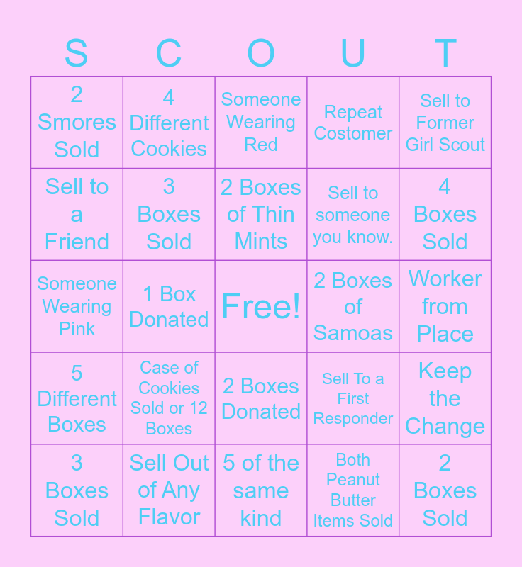 This bingo card has a free space and 24 words: Case of Cookies Sold or 12 Boxes, Sell Out of Any Flavor, 2 Boxes of Thin Mints, 3 Boxes Sold, Sell to Former Girl Scout, 2 Smores Sold, Sell to a Friend, 4 Different Cookies, 2 Boxes of Samoas, 2 Boxes Donated, Sell to someone you know., Someone Wearing Pink, Sell To a First Responder, Keep the Change, 3 Boxes Sold, Both Peanut Butter Items Sold, Worker from Place, Someone Wearing Red, 4 Boxes Sold, 1 Box Donated, 2 Boxes Sold, 5 Different Boxes, Repeat Costomer and 5 of the same kind.