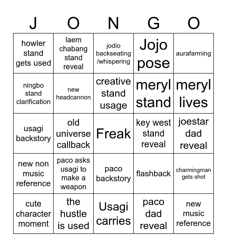 This bingo card has a free space and 24 words: paco asks usagi to make a weapon, the hustle is used, creative stand usage, cute character moment, aurafarming, howler stand gets used, ningbo stand clarification, laem chabang stand reveal, key west stand reveal, paco backstory, meryl stand, usagi backstory, flashback, charmingman gets shot, new headcannon, paco dad reveal, joestar dad reveal, jodio backseating /whispering, meryl lives, old universe callback, new music reference, new non music reference, Jojo pose and Usagi carries.